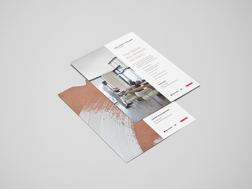 I was tasked with creating a companion / sub-brand and collateral direction for the residential component of the campus - one that reflected the softer, more subdued aesthetic and high-end finishes.